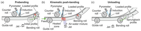 For the analysis of the warping and springback, bending experiments are conducted. The experimental set-up is executed as a kinematic three roll push-bending process (Figure 2). The process is divided in three phases: pre-bending, kinematic push bending, and unloading. In pre-bending (Figure 2a), the profile is clamped between guide roll, counter roll, and bending roll. Between guide and counter roll the profile is only guided so no force is implied in profile thickness direction. To initiate the bending force between bending and counter roll, the bending roll is rotated until the desired bending radius is reached. During the kinematic push-bending phase (Figure 2b) the profile is pushed forward with the feed velocity νf to reach the desired bending angle. The profile is partially heated by induction in one profile area and consequently cooled by a water jet to keep the heated zone small with a length of the heated zone of 95 mm during this phase. Heating and cooling are deactivated for the unloading phase (Figure 2c). The bending roll is retracted, and the profile will spring back.