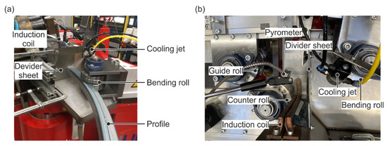 The experiments are performed on a rotatory drawbending machine DB 2060-CNC-SE-F, built by transfluid, Schmallenberg, Germany (Figure 3). The temperature is measured by a pyrometer M318 produced by Sensortherm, Steinbach, Germany. The temperature is measured at the center of the profile width after the profile passes the induction coil. Based on the measured temperature, the power output of the induction generator is controlled. Heating of the profiles is achieved through an induction generator TruHeat 7040 manufactured by Trumpf Hüttinger, Freiburg, Germany with a power of 40 kW. The heating and cooling zones are divided by a sheet of Dotherm D800-M, produced by Moeschter group, Dortmund, Germany, which possesses high temperature stability and low conductivity, to prevent water from reaching the cooling area. The geometry of the unloaded profiles is digitalized through the 3D scanning system ATOS, manufactured by GOM, Braunschweig, Germany, to quantify springback and warping.