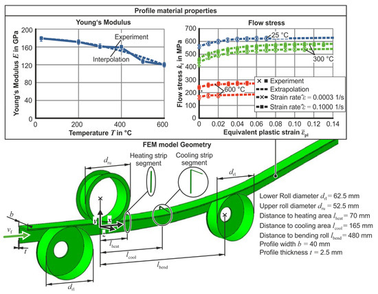 The temperature-dependent Young’s modulus and temperature- and strain rate-dependent flow curves were characterized through isothermal tensile tests on a Z250 tensile testing machine built by ZwickRoell, Ulm, Germany with induction heating. For the tensile tests, specimens with a parallel length of 30 mm and width of 10 mm are used to achieve a homogenous heating. The specimens are produced through laser cutting of the profile material in delivery condition. The strains are measured using a Maytec PMA-12/1N7-1 Extensometer produced by Maytec, Singen, Germany. Logarithmic strain rates 0.0003, 0.003, 0.03, 0.3, and 0.1 1/s as well as temperatures from 25 °C and between 200 and 600 °C in 100 °C steps were investigated (Figure 5). The specimens are evaluated according to ISO 6892. The software Abaqus 2018 with explicit global time incrementation is used for the numerical FE simulation. The profile is discretized with tri-linear hexahedral elements with full integration (C3D8T). The simulations employ full thermo-mechanical coupling. The deformable profile is meshed with 16 elements over the profile width (2.5 mm thick elements). Isotropic, linear, temperature-dependent elasticity is assumed for the workpiece material. The plastic behavior is modelled as isotropic according to von Mises with temperature and strain-rate dependent hardening. The rolls are modelled as rigid bodies with temperature degrees of freedom. The flow curves for each temperature set are extrapolated using a Tanimura–Voce model (see Appendix A for the model parameters)