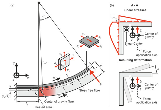 Plasticity in the analytical model is assumed to start at a position x = lp to reach a set bending radius at the center fiber rmC for the profile (see Figure 6a). The counter roll is simplified as fixed support, at which the origin of the coordinate system is located in the profile cross-sectional center of gravity. Resulting from the bending, an angle θ is generated between the forming force F and the position of plasticity onset lp. The forming force F induces a bending moment Mb. The partial heating on the profile is assumed to shift the position of the stress-free fiber ym (T). Additionally, through the forming force F, a section force Q on the cross-section (Figure 6b) is implied, which results in shear stresses τyz due to the difference between the force application axis position and shear center position. The shear stresses result in a torsion moment MT leading to a warping deformation with the warping angle α. The alteration of the stress-free fiber position ym (T) is assumed to influence the position of the shear center.