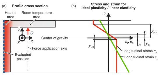 (a) profile cross-section of the partially heated profile, (b) longitudinal stress and strain progression for ideal plastic and linear elastic material behavior and partially plastic behavior over the cross section.