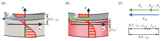 The position of the stress-free fiber due to temperature ym,T needs to be evaluated to calculate the bending moment. To evaluate ym,T, some considerations are necessary. Mechanical equilibrium between tensile and compressive zones for the room temperature case is fulfilled if the stress-free fiber is in the origin of the profile cross section (Figure 8a). Through the lower flow stress, the stress in the heated section is reduced (Figure 8b). As the force equilibrium between both areas still needs to be fulfilled, a shift in stress-free fiber position ym,T is caused. To calculate the position of the stress-free fiber, the forces in the compressive area (FRT and Fh) are related to their corresponding distance at which they act upon. In detail, is related to the room temperature force FRT and is related to the force in the partially heated case Fh. y0 is the distance between the middle of the profile cross section and the center of gravity. Through geometrical considerations, it is then assumed that the share of ym,T on the distance of the compressive zone in the room temperature case () is the same as the share of the force FRT − Fh on the force at room temperature (FRT) (Figure 8c). This means that the force change between the room temperature case and the partial heated case is related to the stress-free fiber shift.
