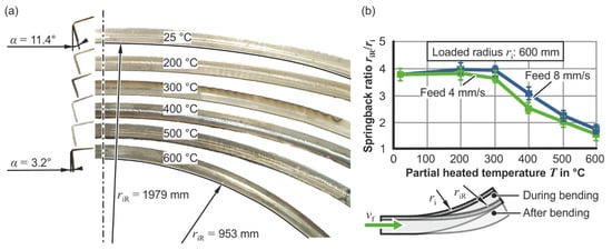 (a) Profile specimens and corresponding cross-sections for a 600 mm loaded bending radius (change of moment arm through the heating area is neglected) and profile feed of 8 mm/s for different temperatures in the sprung back state. (b) springback ratio for varying partial heating temperatures and profile feed velocities.