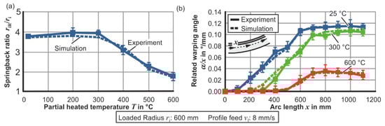 The related warping angle increases linearly over the arc length for each parameter set until a saturation value (Figure 10b) on the arc length of 600–800 mm is reached, after saturation, the related warping angle is constant with a deviation from a constant value of maximum 13%. Related warping angle is decreasing with increasing temperature. After saturation (x = 1100 mm), the decrease for 300 °C is 9% and for 600 °C the decrease is 76% compared to the room temperature curve. The mean deviation between experimental and numerical results for all parameter sets is 10%. The springback is only reduced at temperatures higher than 300 °C. This can be attributed to the flow stress reduction in the cross section. To further discuss this effect, the position of the principal forming zone must be determined.