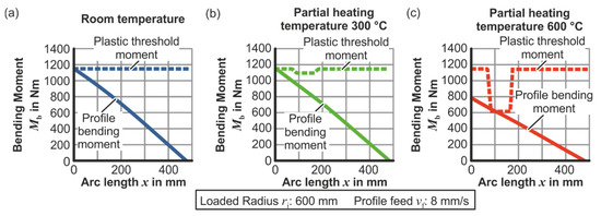 To analyze the influence of the partial heating strategy on springback and warping the location of the principal forming zone is important (Figure 11). The actual bending moment in the profile is evaluated using the bending force of the simulation data. The threshold bending moment is received by solving the bending moment equation (Equation (12)) for the minimum flow stress necessary to receive the set loaded radius. Temperature is assumed constant in the heated area. Plasticity starts at the first position the profile bending moment surpasses the threshold bending moment. For the room temperature case (Figure 11a) and 300 °C partial heating temperature (Figure 11b), the plastic deformation limit is surpassed at the position of the counter roll x = 0. The flow stress reduction for 300 °C is not sufficient for plasticity to start in the heated area. For the 600 °C case (Figure 11c), the bending moment reduction is sufficient for plasticity to start in the heated area at lp = 77 mm. Consequently, the bending moment is only decreased if the heating temperature is higher than 300 °C. The decreased bending moment results in lowered springback of the profile (Figure 9).