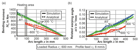 To investigate the accuracy at which the analytical model can predict the bending moment and the profile warping as well as to investigate the warping in the loaded state, bending moment and related warping angle are displayed (Figure 13). Both are evaluated at the start of the plastic zone (x = lp). For the analysis of the related warping angle, the point of zero warping for the 600 °C the curve is shifted to the origin of the diagram to allow an easier comparison with the room temperature and 300 °C cases. The bending moment (Figure 13a) decreases linearly until the position of the bending roll (x = 480 mm) is reached. The bending moment is the highest for room temperature, though the mean difference between room temperature case and 300 °C case is 1%. The bending moments for 300 °C and room temperature cases are the same because they both start plastic deformation at the same threshold bending moment (Figure 11a,b). Compared to the highest bending moment, the highest bending moment for the 600 °C case decreases by 40%. In all cases, the analytical moment overestimates the numerical bending moment with a mean deviation of 7%. The reason for the deviation could be the neglected influence of the normal stresses (assumption 5) or a cumulative effect of the error margins resulting from both numerical and analytical analysis compared to the experimental data. The related warping angles (Figure 13b) are only evaluated at the positions between counter roll and bending roll as the analytical model is only applicable for the loaded state. Thus, the data displayed here are not directly comparable to the unloaded warping angle (Figure 10b). The related warping angles increase approximately linearly as they result from the equation for torsion moment (Equation (10)). The torsion moment behaves linearly over the -axis. The maximum related warping angle of the 300 °C case is decreased by 13% and the maximum related warping angle for the 600 °C case is decreased by 53% compared to the room temperature case. This is analogical to the unloaded state. The analytical model can predict the numerical data with a mean deviation of 10%. It is thus possible for the analytical model to predict the warping and bending moment. The analytical model can now be used for process development and to generalize the results of this study for other profile geometries and materials.