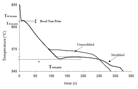 Thermal analysis test: The cooling curve was plotted and analysed using Thermolan®-Al software (Fundacion Azterlan, Durango, Spain). The thermocouples were located at the centre of the metallic mould with a diameter of 40 mm and length of 35 mm. The main thermal analysis parameters were measured, including the minimum temperature of the primary aluminium (TAl pr min), its recalescence temperature (RecalTem Prim) and the minimum Al-Si eutectic temperature (Teut min), as shown in Figure 2. The software predicted the modification rate based on the model developed in Azterlan for V-HPDC AlSi10MnMg alloys.