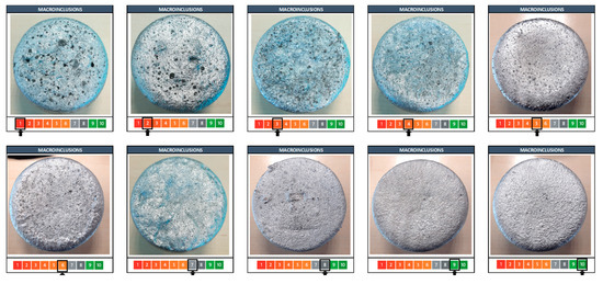 The macroinclusion levels of the melt were classified following the chart shown in Figure 3, with 1 being the worst inclusion level and 10 being a perfect situation.