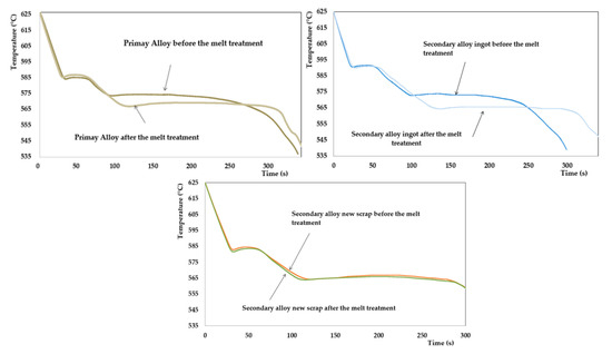The cooling curves for the different alloys before and after the melt treatment.