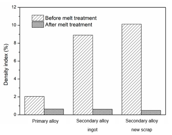 Density index values for the three alloys at different stages (before and after the melt treatment).