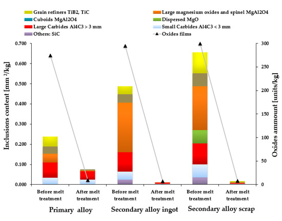 Regarding the quantification of the inclusions, the contents of microinclusions were significantly worse in the secondary alloys than in the primary alloy before the melt treatment, with the secondary new scrap alloy having a total inclusion content of 0.69 mm2/kg, which was the worst value. The differences between the inclusion contents were mainly seen in the large magnesium oxides and spinel MgAl2O4 inclusions. Dispersed MgO inclusions were also observed in the secondary alloy made from new scrap; however, the oxide film contents were similar in all aluminium alloys (the primary alloy had 275 oxides per kg, the secondary alloy from ingots had 295 per kg and finally the secondary alloy made from new scrap had 300 per kg). After the melt treatment, the aluminium melts significantly improved the microinclusion levels in all three alloys, with very similar levels seen for all of them (with microinclusion levels lower than 0.1 mm2/kg and oxide films lower than 10 per kg; surprisingly, the primary allow from ingots had the highest value).