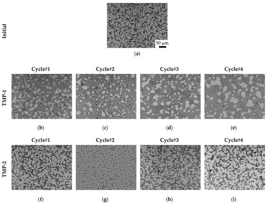 Moreover, Table 3 summarizes the average size and area fraction of the lead particles. In general, there is a relatively small increase in the particle size with increasing cycles for the two schemes, increasing initially from about 2.5 μm to 3.1 μm and 2.9 μm after four cycles for TMP-1 and TMP-2 schemes, respectively. Coarsening lead particles by TMP accompanies a decrease of the area fraction of particles from 3.1% to 1.7% and 2.3% for TMP-1 and TMP-2, respectively. It is thus concluded that the use of higher annealing temperature in the TMP-1 scheme (670 °C) promoted more substantial coalescence and melting of the small lead particles during the annealing process than the TMP-2 scheme.