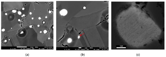 Figure 2 shows OM micrographs for samples subjected to TMP-1 and TMP-2 schemes, illustrating the microstructure development with successive cycles. In the TMP-1 scheme, grain coarsening occurred for both the α phase (light phase) and β′ phase (dark phase) with increasing cycles. Moreover, the area fraction of the β′ phase increased with increasing cycles, and many of the β′ islands became connected. On the other hand, the use of the TMP-2 scheme resulted in a minimal change in the grain (island) size and area fraction of the β′ phase. Moreover, the size and distribution of the lead particles were influenced by TMP. In general, the increase in the number of cycles resulted in limited coarsening of the lead particles. For both TMP schemes, relatively coarser lead particles formed in the microstructure due to TMP, and they became less uniform with increasing cycles. The results also show that many lead particles formed at the α-β′ interfaces, while very few particles are present in the grain interior. In addition, Figure 3 shows high-magnification micrographs, further illustrating the effect of TMP on the distribution and size of lead particles. Many of the particles are preferentially located at the α-βʹ interphase boundaries (Figure 3a). As indicated by the cursor in Figure 3b, a lead particle is located close to an annealing twin, suggesting that lead particles might be nucleation sites for annealing twins. Figure 3c illustrates the coalescence of several lead droplets resulting in a coarse lead particle of about 3.5 μm.