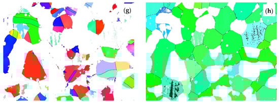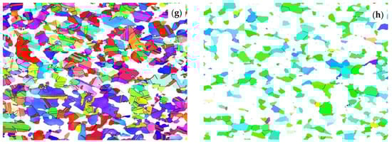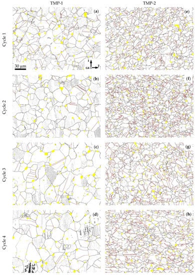 Figure 6 presents the grain boundary construction maps for the same phase maps shown in Figure 5. The two TMP schemes generally led to an increase in the average grain size with increasing cycles. Nevertheless, grain coarsening is more pronounced for the TMP-1 scheme. It is also evident that the TMP-1 scheme is not an effective GBE process to promote the formation of a large fraction of annealing twins of Σ3n boundaries, as demonstrated in Figure 6a–d. Annealing twins are weakly present in the α grains, though most of these grains are fully recrystallized. Many βʹ grains contain LAGBs, suggesting that the annealing time was enough to cause recovery and not recrystallization since dislocation debris was still a remnant from the deformed state [16]. Moreover, the TMP-2 scheme produced a more homogenous duplex structure, where both α and βʹ grains contain a tiny fraction of LAGBs, as illustrated in Figure 6e–h. The formation of annealing twins of Σ3n boundaries substantially occurred in the α grains, resulting in clusters of α grains that are more connected together through a massive network of Σ3n boundaries. Consequently, further generation of Σ3n boundaries was facilitated with successive TMP cycles, as also reported by Randle [5].