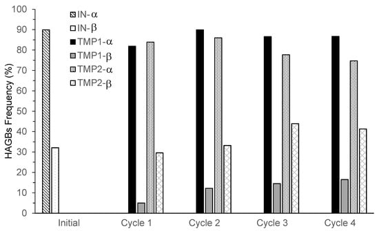 Figure 7 represents the evolution of HAGBs in α and β′ phases for both TMP schemes. For the initial material, the α phase contains an enormous fraction of HAGBs (~90%), while the β′ phase has HAGBs of ~32%. For the two TMP schemes, the fraction of HAGBs in the α phase is high, in the range of 75–90%. Such a high fraction of HAGBs, in which most of the boundaries have Σ3n characteristics, indicates that the α phase has gone through complete recrystallization. On the other hand, the fraction of HAGBs in the β′ phase strongly depends on the TMP scheme. In the TMP-1 scheme, the fraction of HAGBs in the β′ phase was very low (5%) after cycle 1, and it gradually increased to ~17% after cycle 4. Such development is mainly attributed to the accumulation of LAGBs that were only recovered in some large β′ grains without complete recrystallization, as illustrated in Figure 6a–d. Moreover, the gradual reduction of LAGBs in the β′ phase with successive cycles in the TMP-1 scheme suggests that the newly formed β′ grains have a dislocation-free structure, while the remnant of the β′ grains from the initial structure still contains dislocation debris. For the TMP-2 scheme, the fraction of HAGBs in the β′ phase increases with successive cycles, rising from ~30% for cycle-1 sample to 42% for cycle-4 sample. As demonstrated in Figure 5, most of the β′ grains have recrystallized, enhancing the formation of HAGBs. Moreover, the area fraction of β′ phase remains almost unchanged for TMP-2 samples (~35%), as presented in Table 4. This suggests that the amount of energy provided for βʹ phase during annealing was sufficient for recrystallization of the deformed βʹ grains without noticeable phase growth.