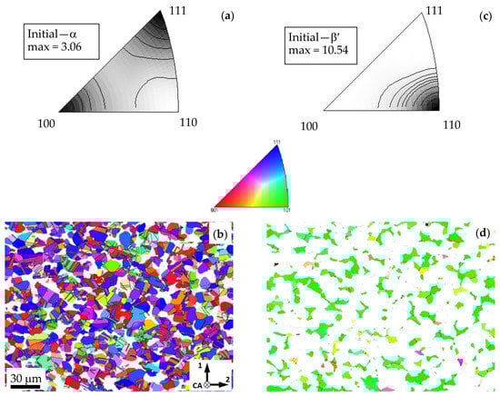Figure 8 shows the inverse pole figures (IPFs) and orientation maps of α and β′ phases sample in the initial condition. The IPFs and orientation maps were constructed to show the distributions of compression axis (CA) in the crystal coordinates. As presented in Figure 8a,c, the initial textures of both phases show strong tension fibers, where the {111} and {100} planes become perpendicular to the compression axis for the α (fcc) phase and {110} planes are perpendicular to the compression axis in the case of β′ (bcc) phase. The texture development demonstrates that the texture produced by cold drawing was strongly preserved even after annealing for 1 h. In addition, the IPF maps presented in Figure 8b,d show that partial weakening of the texture occurred in the α phase due to the formation of annealing twins. The texture weakening is demonstrated by the formation of a weak {110} fiber along the axial direction. On the other hand, the majority of the β′ grains are oriented parallel to {110} planes, implying that limited recrystallization occurred in the βʹ phase during the initial annealing treatment. Such texture development is strongly correlated with the microstructure presented in Figure 4 and Figure 7, where the moderate formation of LAGBs in the initial βʹ structure furthered the promotion of strong fiber texture in the β′ phase.