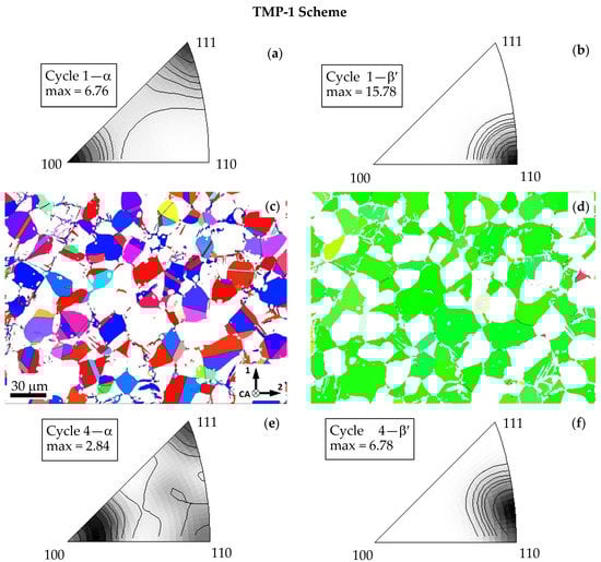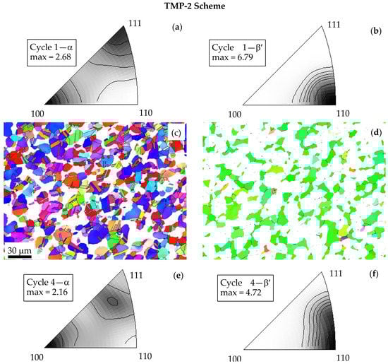 Figure 10 presents the texture development for samples processed by the TMP-2 scheme. The IPFs shown in Figure 10a,b for a sample processed by one cycle indicate that the initial texture was strongly preserved for both phases. Nevertheless, the maximum intensity was less than obtained for a sample processed for one cycle using the TMP-1 scheme. In the case of four cycles, the texture intensity further weakened for both phases. Figure 10e shows that the {111} fiber disappeared in the α phase as the plane orientation of many grains shifted toward the {110} planes. On the other hand, the {110} fiber was preserved for the βʹ phase, as demonstrated in Figure 10f. However, there are more grains aligned nearby the {111} planes, as compared to the sample processed by one cycle.