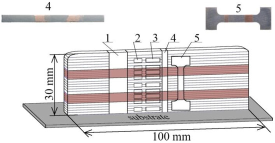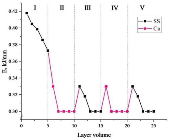For convenience, the bimetallic layered macrocomposite was divided into five areas: area I—printing the first five layers of stainless steel onto the substrate; II and IV—printing five layers of copper onto the already deposited steel; III and V—printing stainless steel layers onto the already deposited copper layers.