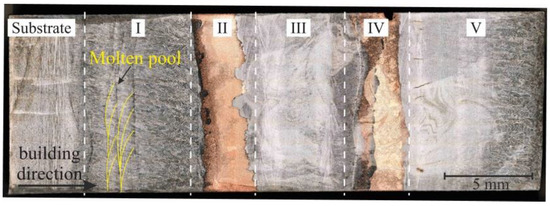 Optical microscopy of the longitudinal section of a sample of bimetal layered macrocomposite. The white dashed lines show the boundaries of the sample by zone. The boundaries of the melt pool are marked with yellow lines. The sample was divided into five areas: area I—the first 5 layers of stainless steel on the substrate; II and IV—5 layers of copper on the already deposited steel; III and V—stainless steel layers on the already deposited copper layers.
