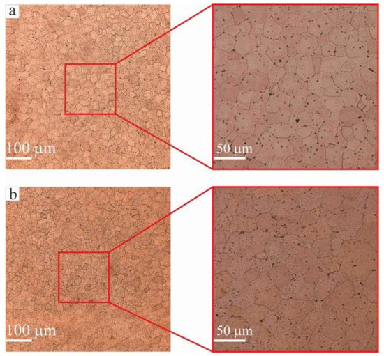 Optical microscopy of copper interlayers: (a) zone II; (b) zone IV. Copper interlayers have only equiaxed grains with an average size of 28.5 ± 0.2 μm.