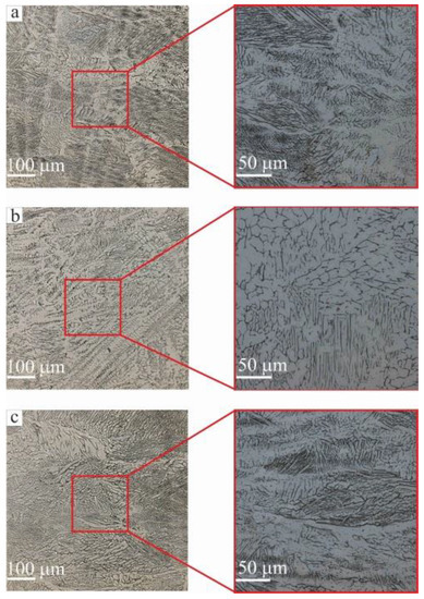 Optical microscopy of steel areas: (a) zone I; (b) zone III; (c) zone V. The morphology of the grain–dendrite structure of stainless steel areas.
