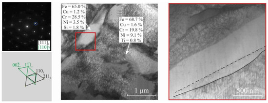 SAED pattern with interpretation and dark-field TEM image for steel areas. The elemental compositions of the γ- and δ-Fe regions in wt. % revealed by EDS analysis. The typical composition of the ferrite phase is Fe-(27.2–29.3)Cr-(3.2–3.8)Ni (wt. %). The red rectangle marks the enlarged zone of δ-ferrite lamellae, the boundaries of which are partially curved.