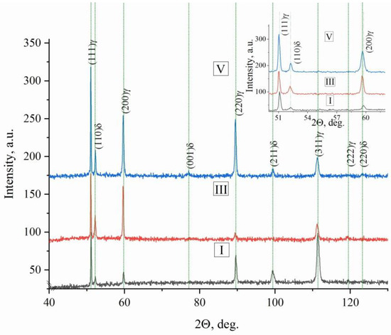 where Iδ is the integral intensity of the peaks corresponding to the δ-Fe phase; ∑IA is the sum of all analyzed integral intensities.