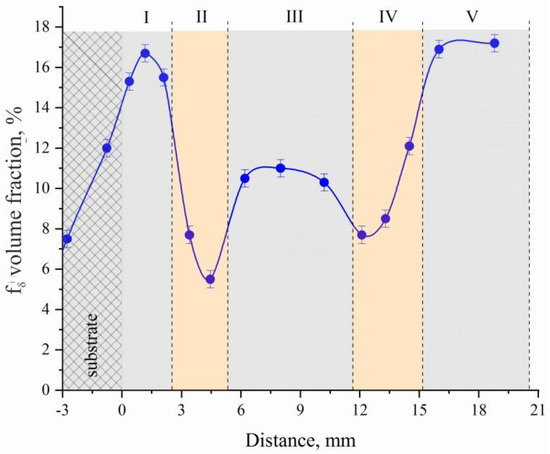 Moreover, the volume fraction of δ-Fe in different parts of the sample is different: for zones I and V of steel sections, the volume fraction of δ-Fe varies within the range fI,V(δ-Fe) = (16.3–17.2); for zone III, a decrease in fII(δ-Fe) of 1.7–1.9 times as compared to the volume fraction for zones I and V of steel sections is typical.