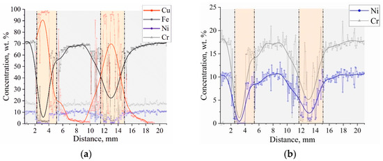 The change in microhardness along the height of the multilayered sample is similar to the change in chemical composition along the height (Figure 10a). The analysis of the distribution of microhardness at transitions through copper layers testifies to a sharp change in mechanical properties in a material from a value of microhardness of 1.85 GPa, corresponding to austenite steel, to a value of 0.91 GPa in the copper part of a sample. The gradual change in microhardness on the boundary of Fe–Cu zones is connected with partial inclusion of copper in steel, and on the boundary of Cu–Fe zones—inclusions of steel in copper layers. Basically, such changes are connected with the formation of mechanical mixtures of components of the system at various structural-scale levels and are not caused by the formation of new phases.