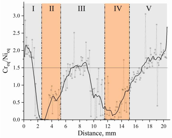 It is seen that all experimental methods of determining the volume fraction of the δ-Fe phase are consistent with each other. There is a general tendency for the volume fraction to decrease in the middle of the sample and when approaching the copper interlayers, zones II and IV. This is due to the fact that copper, like nickel, is a stabilizer of γ-Fe, in this case, the ferrite that occurs during the last stages of solidification [44]. The liquid projection begins in the peritectic region in the Fe–Ni system and proceeds to the eutectic reaction in the Cr–Ni system in the Fe–Cr–Ni ternary system. The eutectic ferrite is then located along the boundaries of the austenite grains, in contrast to Widmanstatten pattern morphologies, in which the ferrite is contained mainly in the core grains. The microstructure, as shown in Figure 6, in this alloy, can be characterized by regions of both eutectic ferrite and skeletal ferrite. The characteristics of Widmanstatten pattern morphologies of alloy 321 were also revealed. Values for the alloying elements to calculate the Ni–Cr equivalents ratio were obtained by SEM. Figure 10 shows the variation in the basic and alloying elements of the material.