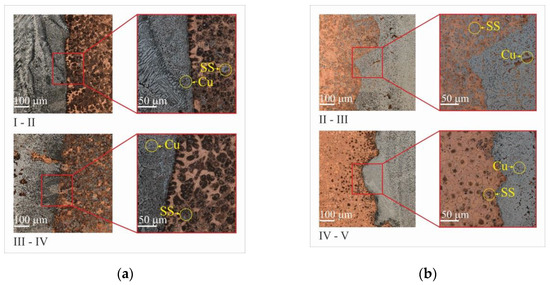 Optical microscopy of boundary of “SS–Cu” (a) and “Cu–SS” (b) in bimetal laminate macrocomposite produced by electron beam additive manufacturing.