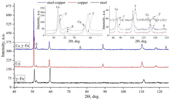 As can be seen from Figure 12, the Fe–Cu and Cu–Fe transition boundaries have a complex shape. At the same time, as written above, the alloying of copper with steel and the mixing of copper into the steel layers takes place. If we take into account the total length of the transition boundaries up to 1 mm, the CTE value is just in the range of αT(Cu) > αT(SS-Cu) > αT(SS). With the difference in CTE values, the components of the polymetallic product create stresses at the component boundaries when heated and thereby prevent the expansion of the polymetallic sample. As a result, the polymetallic zone boundaries are stressed and mutually limit component expansion when heated. This can have a positive effect in the fabrication of structural parts operated in a large temperature range, when it is necessary to consider gaps in the mating of parts.