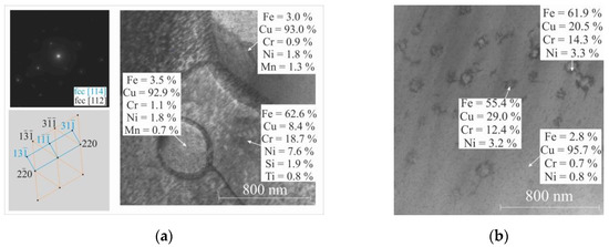 TEM image of bimetal laminate macrocomposite boundary: (a) “SS–Cu” shows hardening of steel with copper; (b) “Cu–SS” shows spinodal decomposition. The elemental compositions of the Cu-based and Fe-based samples in wt. % as revealed by TEM EDS analysis.