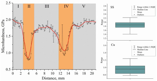 Copper interlayers of the sample are of particular scientific interest due to the effect of grain size, which is described by the Hall–Petch ratio. In this case (Figure 5), a fine-grained structure is observed in the copper interlayers (zone II and IV).