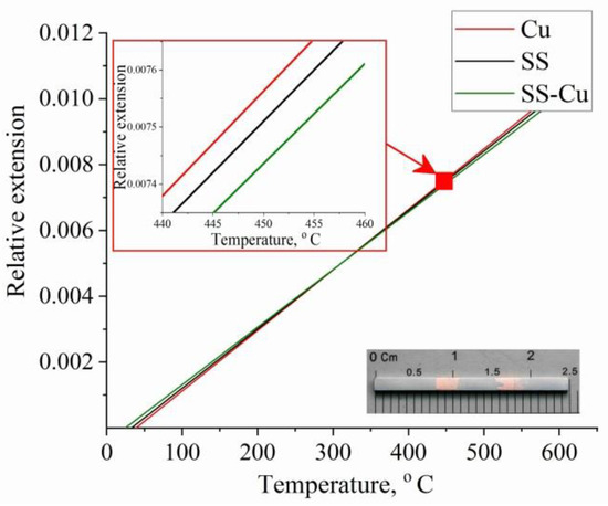 The measurement result of the coefficient of thermal linear expansion (CTE) is shown in Figure 16. The CTE values for copper, steel and polymetallic samples are αT(Cu) = 1.83992 × 10−5, αT(SS) = 1.80035 × 10−5 and αT(SS-Cu) = 1.74819 × 10−5, respectively. The additively grown copper and steel samples were found to have a higher CTE compared to the polymetallic sample.