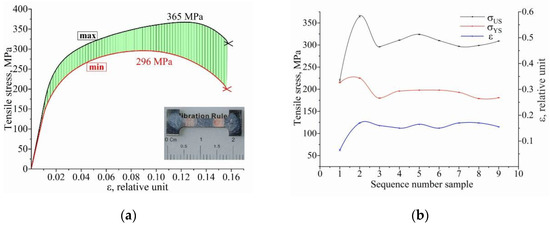 The stress–strain plots are shown as the extreme values of the mechanical characteristics in Figure 17. The green shaded area highlights the values that include all of the obtained values of ultimate strength, yield strength and strain to failure. As can be seen, the test result of sample #1, cut in the extreme position of the polymetallic sample, has the worst performance. This is due to a defect in the form of a discontinuity, which caused the sample to fracture. The remaining tensile samples #2–9 have similar characteristics and have tensile strength σUS = 314 ± 23 MPa, yield strength σYS = 194 ± 15 MPa and strain to failure ε = 0.16 ± 0.01 (Figure 17b).