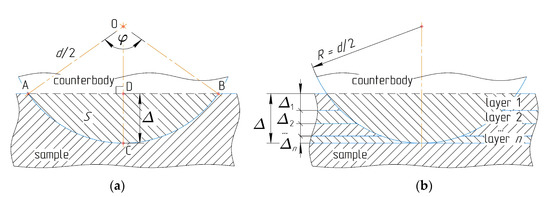For simplifying further modeling, the following assumptions are used. Firstly, the total wear depth Δ is reached gradually. Particularly, for the case study considered below, the ratio of the wear depth to the counterbody diameter is of the order from 10–5 to 10–4. In this regard, elastic deformations of layers are not considered.