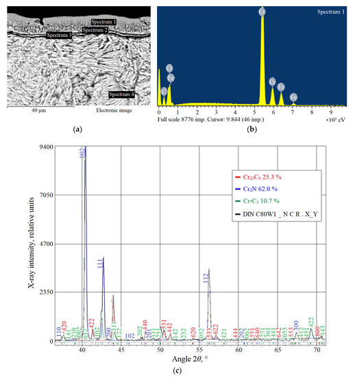 Microstructure in reflected electrons (a), diffractogram (b), and spectral curves (c) of steel DIN C80W1 after chroming and nitrogenchroming (temperature—1050 °C, time—4 h).