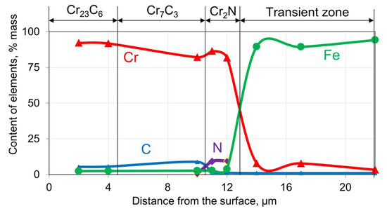 Quantitative distribution of chemical elements in the coating, transient zone, and base of steel DIN 105WCr6 after nitrogenchroming are presented in Figure 6 and summarized in Table 4.