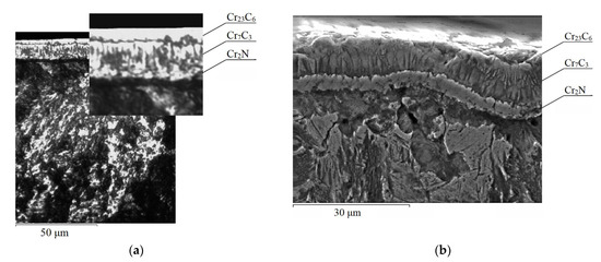 The results presented in Figure 4a,b (qualitative and quantitative spectral analysis of samples after chroming) were obtained from the thickness of the diffusion layers on the scanning electron microscope “JSM-6490LV” (Tokyo Boeki Ltd., Tokyo, Japan). In this case, X-ray spectral analysis of samples after chroming and nitrogenchroming on the outside surface of the coating was not performed since the authors preferred the layer-by-layer method on transverse sections. The operating parameters of the stand are as follows: under pressure 5 Pa, accelerating potential difference 10–20 kV, amperage 10–15 mA, probe diameter 1–2 μm. Under these conditions, the penetration depth of the electron beam is in a range of 0.7–1.0 μm. This fact allowed us to analyze only the outer layer of the coating, the thickness of which is 3 μm. In turn, the selected scanning method on the cross-sections provides information about all three layers of the coating separately.