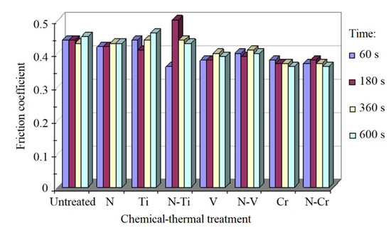 Therefore, an increase in test duration decreases the friction coefficient for the samples with coatings. Steel DIN C80W1 has the lowest friction coefficient after chromizing and nitrogenchroming. As a result of tests for steel DIN C80W1 under sliding friction without greasing, the following sequence of treatments in ascending order of the friction coefficient is observed: nitrogenchroming, chroming, vanadizing, nitrogenvanadizing, nitrogentitanizing, titanizing, and nitriding.