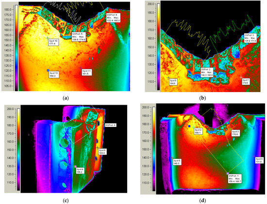 - Loading by welding the active area of the trimming die; the deposition of the welding seams on the active surface of the trimming die was performed on a warm bed (an additional heat source was provided during the technological welding process she maintained the material of the trimming die at a temperature of 500 °C). The deposition of the material layer by welding was performed using Tooltrode60 electrodes with diameter Ø = 4 mm, being taken into account the following parameters of the welding regime: welding current—Iw = 170 A; welding voltage—Uw = 28 V;