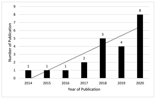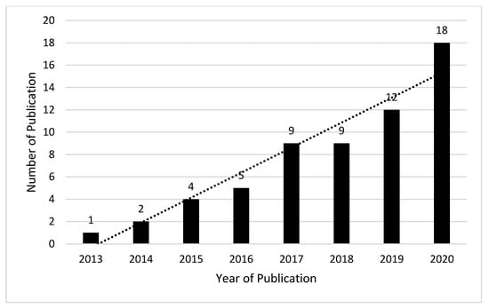 The English language articles were extracted using the Google Scholar search engine without applying any year limitations. The reason we used Google Scholar for article extraction was that it covers published work from all journals, either from the Web of Science index, Scopus index or anywhere else. Figure 2 shows the distribution of the articles of graphene- and metal-based composites, and Figure 3 shows the distribution of the articles of polymer-based composites. The number of publications is limited as only those articles which come under the formed combination, i.e., graphene- and metal-based composites, and graphene-, metal- and polymer-based composites were taken into account. A gradual increase in the publications occurred over time. An interesting thing which was also observed that with time the focus is more towards the polymer-based composites as they emerged as promising shielding materials.