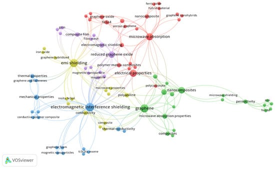 Blue nodes with 13 occurrences, which is the first cluster, were built on the terminology “Electromagnetic interference shielding”. In the same color pattern, the terms “Mechanical properties”, “Thermal properties” and “Thermal conductivity” with occurrences three and two, respectively, can also be seen. The following cluster also includes some other keywords and the linkage between all the keywords shows the relation of each keyword in a particular domain. Green nodes with 11 occurrences, which is the second cluster, were built on the terminology “Graphene”. In the same color pattern, a few keywords like “nanocomposites”, having six occurrences, and “Microwave absorption properties” with three occurrences, were also presented. Other keywords such as “absorption properties”, “magnetic property” and “permeability” show researchers’ interest in this region. Yellow nodes with 11 occurrences, which is the third cluster are built on the terminology “EMI shielding”. This cluster is augmented with various polymers keywords like “Single wall carbon nanohorn, “Insitu Fe3O4” and “Iron Oxide”. The fourth prominent cluster had red nodes around the term “Microwave absorption” and “Electrical properties” with eight occurrences both. The fifth prominent cluster had green nodes having the keywords “Reduced graphene oxide”, with six occurrences.