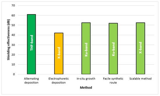 It can be observed that for the preparation of graphene- and metal-based composites various methods have been utilized. Interestingly, graphene and metals family materials were constructed with different methods, illustrating that the structure of the material significantly depends on the selected method. Hydrothermal and solvothermal are the two most common methods that have been used extensively for these composites. The composites formed by these methods were tested up to the Ku-band frequency range, where the highest reflection loss of −55.02 dB was achieved using hydrothermal and reflection loss of −59.23 dB was achieved using the solvothermal method. The highest shielding effectiveness of 52.4 dB in X-band was achieved via using the scalable method. The higher shielding of 60.95 dB was achieved in THF-band by alternating deposition where graphene and copper were synthesized. In this case, the role of materials properties also gives significant input. Figure 5 shows the maximum shielding effectiveness achieved by utilizing the various methods in different frequency ranges.