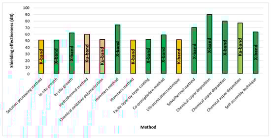As shown in Table 2, to form a polymer-based composite, various methods have been used where the most adopted methods are solution processing method, in situ growth, hydrothermal method, Hummer’s method and solvothermal method. In the X-band frequency range, the highest total shielding effectiveness was achieved up to 90 dB by utilizing chemical vapor deposition. In Ku-band, the highest total shielding effectiveness was achieved up to 60 dB with a reflection loss of −61.4 dB by making a composite with the hydrothermal method. In the K-band frequency range the maximum total shielding effectiveness of 51.4 dB, 51.1 dB and 51 dB by using ultrasonication technique, Hummer’s method and solution processing method. While a reflection loss of −61 dB was achieved via the solution processing method. In the Ka-band frequency range, the highest total shielding effectiveness of 77 dB was achieved by using chemical vapor deposition. Overall, this method gave better shielding in both X-band and Ka-band. A high reflection loss of −78 dB was also observed in the V-band frequency range by the ultrasonication method. A comparison of all the methods has been drawn in Figure 6 which gives shielding effectiveness greater than 50 dB in their respectable frequency ranges.