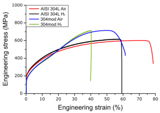 The mechanical properties of the investigated steels were determined by tensile tests at room temperature both in air atmosphere under ambient conditions and in a hydrogen gas atmosphere under a gas pressure of 10 MPa. The results of tensile testing are presented in Table 3 and exemplary stress–strain curves are shown in Figure 1. The results reveal that the mechanical properties of AISI 304L and 304 mod in air atmosphere do differ, although the chemical composition of the investigated alloys varies only slightly (see Table 1). AISI 304L reaches the highest elongation to fracture, whereas 304 mod exhibits the highest tensile strength. The sigmoidal course of the stress–strain-curve of 304 mod, characterized by a secondary increase in strength, and the maximum strength with the minimum elongation to fracture is attributed to the almost entire transformation of the austenitic phase into α’-martensite (see Table 3) [22].