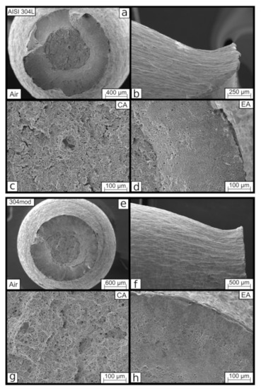 In air atmosphere, the investigated steels show a ductile failure, independent on the content of strain-induced martensite (see Table 3 and Figure 1). The fracture surfaces of the investigated steels confirmed the ductile failure. First, the fracture surfaces of both steels indicate a cup and cone fracture shape.