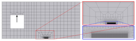 The finite element mesh of the specimen (Figure 2) is composed by three distinct zones: a very refined area near the crack tip, a transition zone, and a coarser mesh in the far side of the crack zone. The more refined zone considers a rectangular box with elements of 8 × 8, allowing an accurate prediction of the stress and strain fields at the crack tip zone [37]. On the other hand, the coarser zone allows to reduce the computational cost. In the end 7287 linear hexahedral finite elements and 14,918 nodes were used.