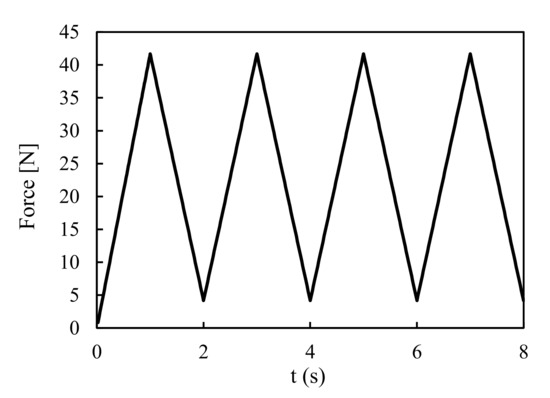 The CT specimen is loaded, in mode I, with constant amplitude load cycles, which vary between a minimum force of 4.17 N (Fmin = 4.17 N) and a maximum force of 41.67 N (Fmax = 41.67 N). This leads to a stress ratio of 0.1 (R = 0.1). Some load cycles are presented, in terms of the pseudo-time in Figure 3, highlighting the triangular load pattern.